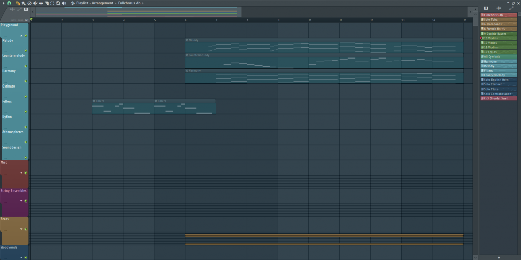 My very first achievement here is, that I restructured my FL Studio template. This was necessary anyway, since FL Studio evolved, and other composers seem to do this on a regular basis anyway – Tom Holkenborg for instance created 5 episodes on this on Youtube. In my case I split the “playground area”, that I had in my former template, into 8 track:
