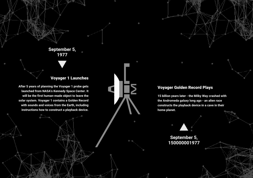 The idea in very very short: The Voyager I space probe travels through space 15 billion years, and arrives at an unknown planet. An intelligent alien race is able to decode the instructions to playback the content of the Voyager Golden Record at the side of the probe.