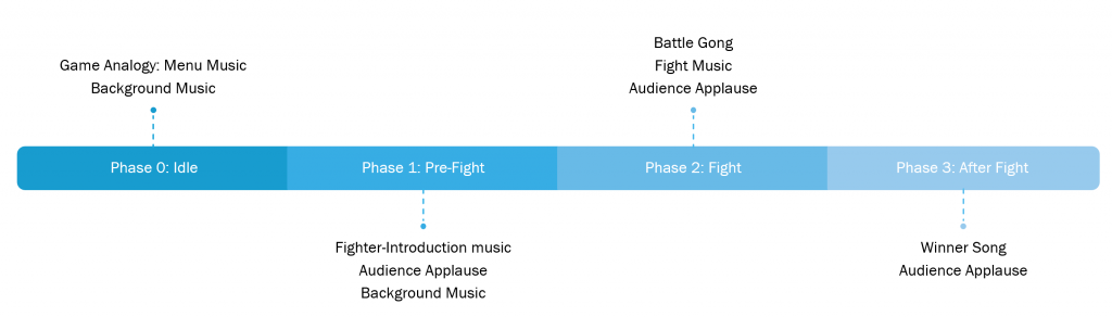 All we had to do was to come up with audio concept for all of these phases, compose or collect music, and enrich that with sound effects to get more punch into the robot fights and the crowd. Thus we began to search for free music, evaluate licenses, create own music, select sound effects, create loops, come up with a working and stable 3-person-setup, and so on and so on.